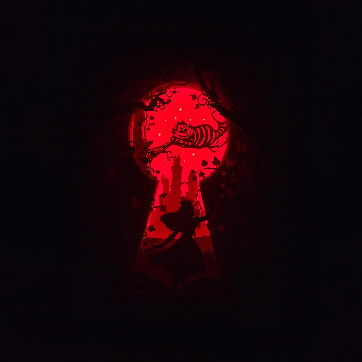 A huge thank you to Lewis Carroll for inspiring this beautiful lightbox. Featuring the whimsical Cheshire Cat and the young lady who discovers a whole new world down the rabbit hole. Perfect for a little’s room, a study, library – or anywhere books are enjoyed.