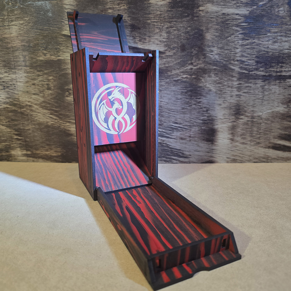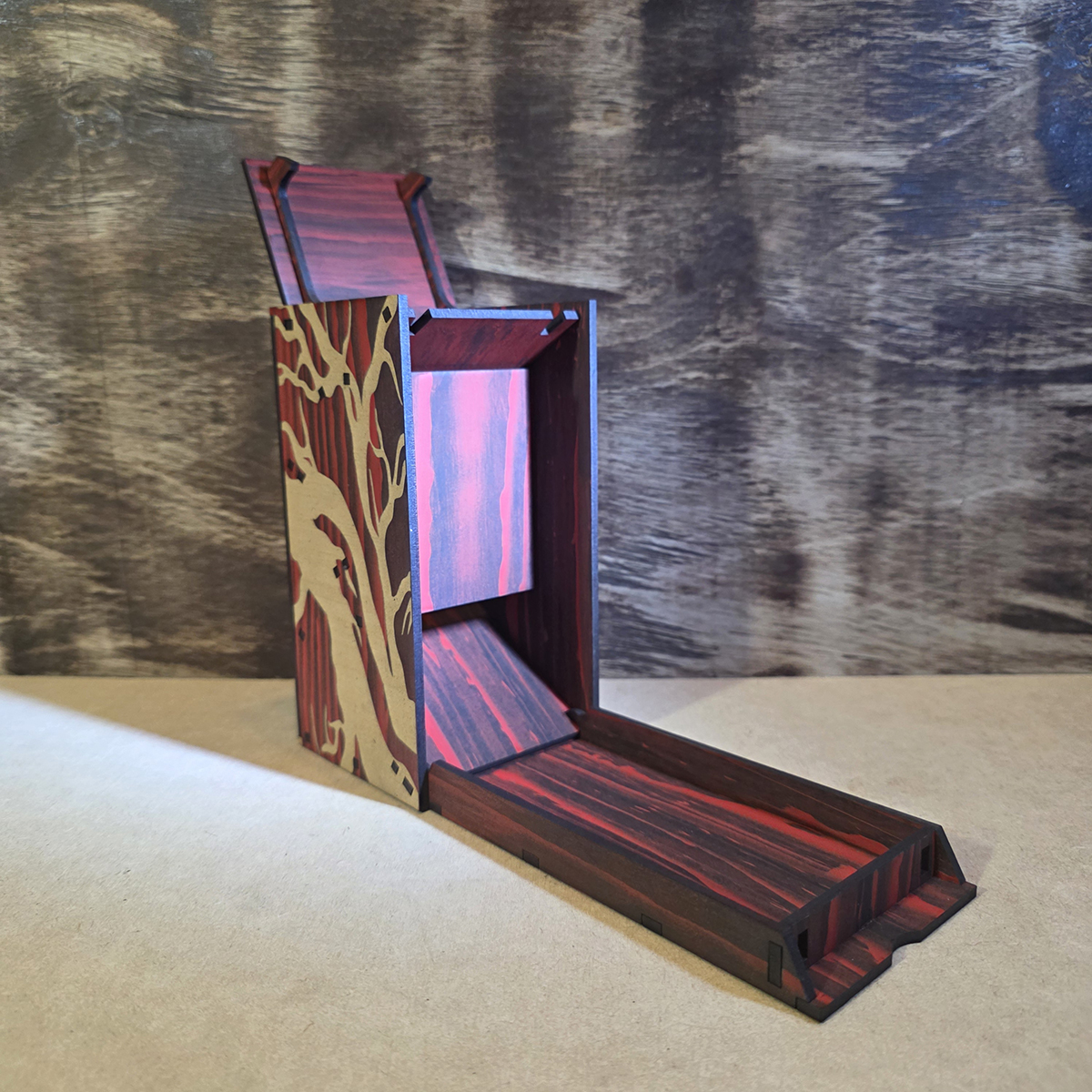 Carved from the sinister Dark Trees of the Aerilpar Forest in the Shining South, this dice tower embodies the eerie essence of its malevolent origins. Its jet-black bark, streaked with crimson veins stained by the blood of intelligent creatures, channels the chaotic energy of the forest’s cursed groves. As your dice tumble through its twisted hollows, feel the pulse of ancient malice guiding your rolls, ensuring every game is steeped in the dark allure of the Forgotten Realms.