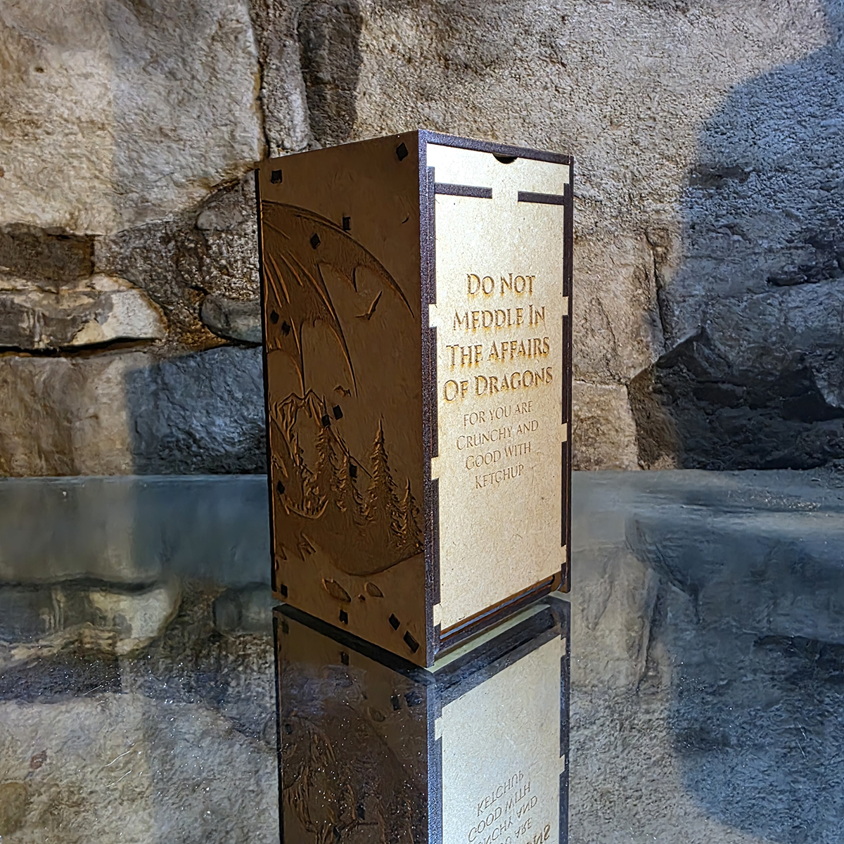 Do not meddle in the affairs of dragons! It’s… well it’s just not a good idea. This misfit happened because someone (we won’t say names, despite there only being one person) forgot to center the text on the front. So, our loss is your gain.